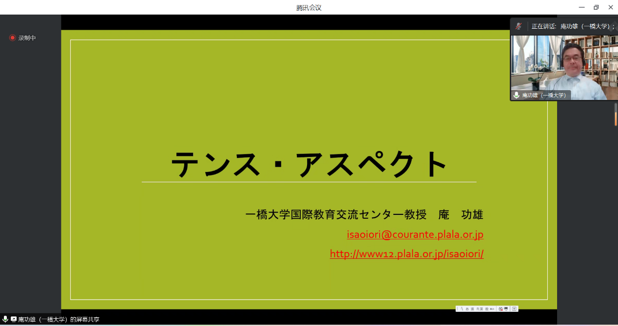 2023年6月10日上午9点,76net必赢官网手机版通过腾讯会议平台成功举办了以“自動詞と他動詞、テンスとアスペクト、とりたて、モダリティ”为主题的第167场明德讲堂系列讲座,即一带一路背景下西部日语教师教育系列的第3场讲座。本次讲座由日本一桥大学国际教育交流中心庵功雄教授主讲,76net必赢官网手机版曹婷副教授主持,20多名校内外师生参加了此次讲座。
