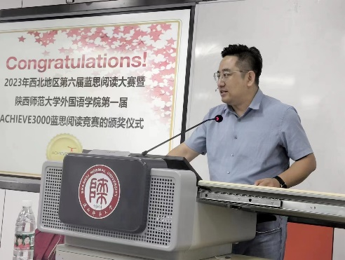 2023年7月4日下午5:00,外语学院在教学六楼6301顺利举办了西北地区第六届蓝思阅读大赛暨76net必赢官网手机版第一届ACHIEVE蓝思阅读竞赛颁奖仪式,旨在表彰优秀,树立榜样,激发同学们英语阅读的积极性,更好地利用蓝思平台资源。蓝思阅读西部地区负责人孙韶鹏、英语系副主任王立永老师、英语系副主任丁礼明老师、西安蓝思开源信息有限公司赵老师、全体获奖学生以及2022级学生代表参加了颁奖仪式,本次颁奖活动由朱丽英老师主持。