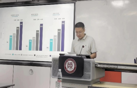 首先,蓝思阅读西部地区负责人孙韶鹏对蓝思的使用情况进行了简要介绍。孙韶鹏指出,通过蓝思分级阅读练习,同学们的英语水平能够全方位得到提升。蓝思丰富的文章素材,不仅能助力学生提升语言能力,还能帮助他们拓宽视野。蓝思平台通过科学的系统,分析筛选出适合学生认知水平和语言发展的材料,满足了学生个性化阅读的需求。