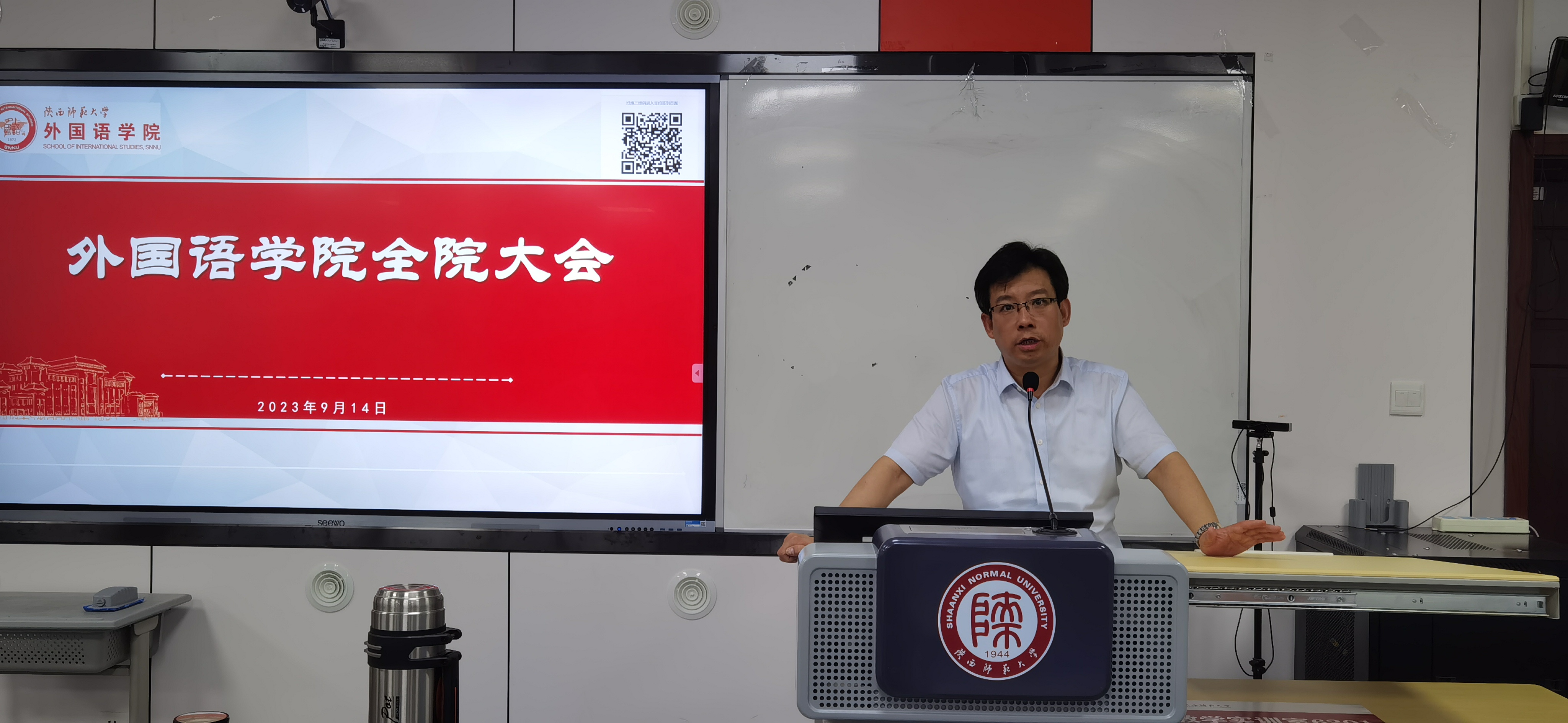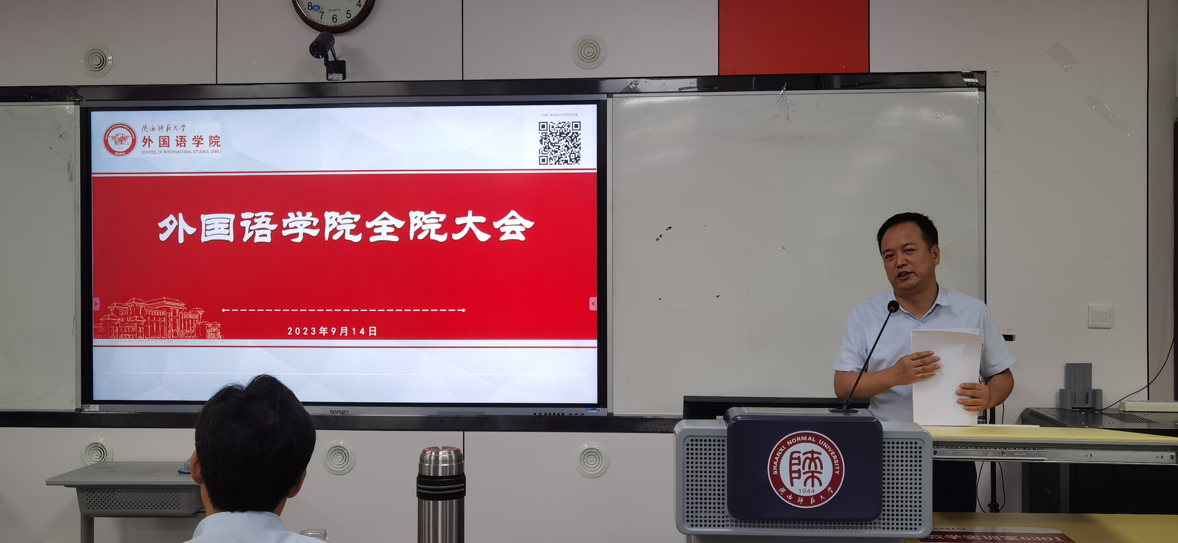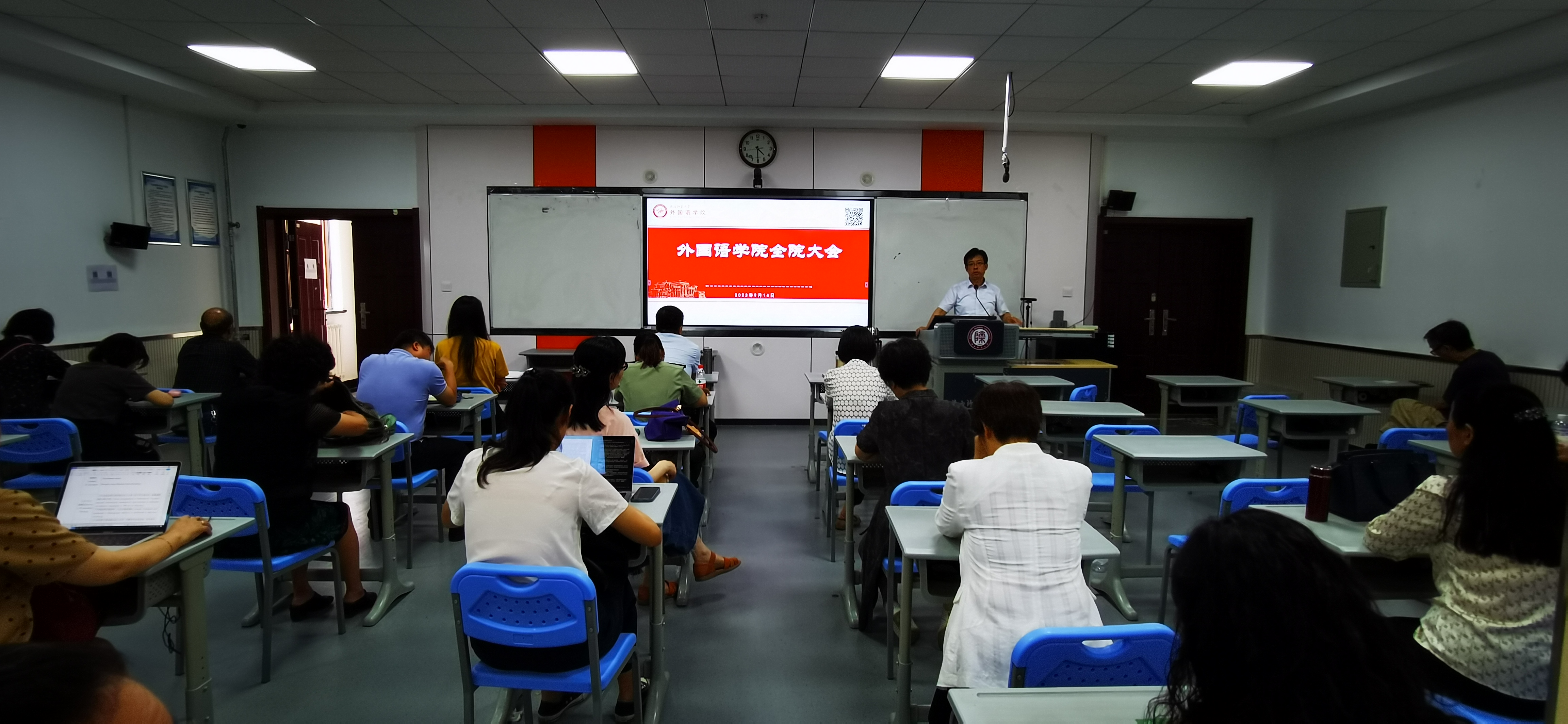 9月14日下午4时,76net必赢官网手机版在雁塔校区教学六楼301、346召开新学期工作部署大会。院长刘全国,副院长孙坚、吕敏宏、曹婷、王幸生、朱冬怡,党委副书记鲁燕以及全院教师参加了会议。会议由学院党委书记董增云主持。