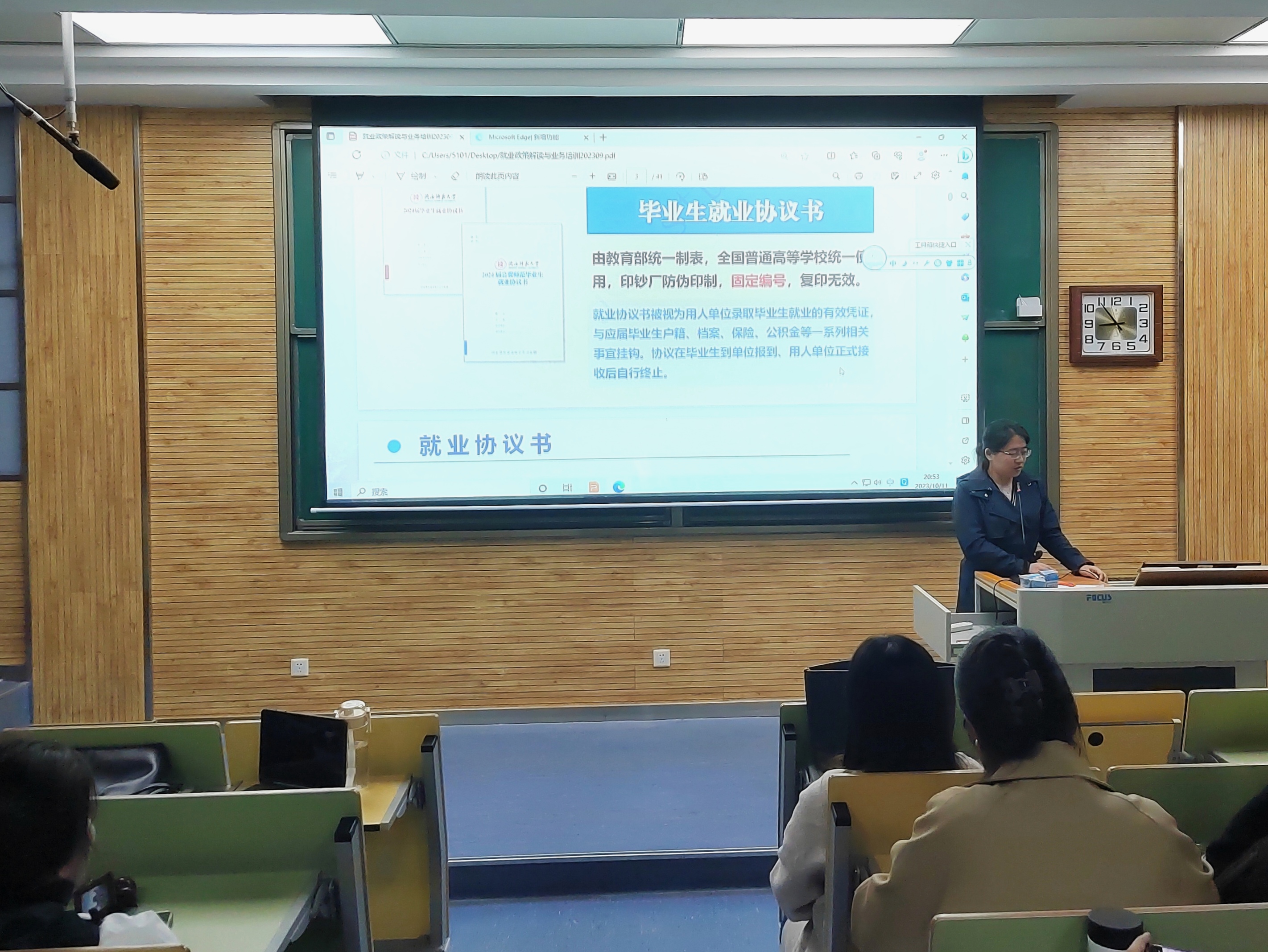 随后,董洁就签订三方协议等就业工作做具体说明。她向毕业生详解就业协议签约流程,着重强调就业协议书、就业推荐表中的注意事项以及违约办理流程等,强调毕业生要诚信,并为其集中发放三方协议。
