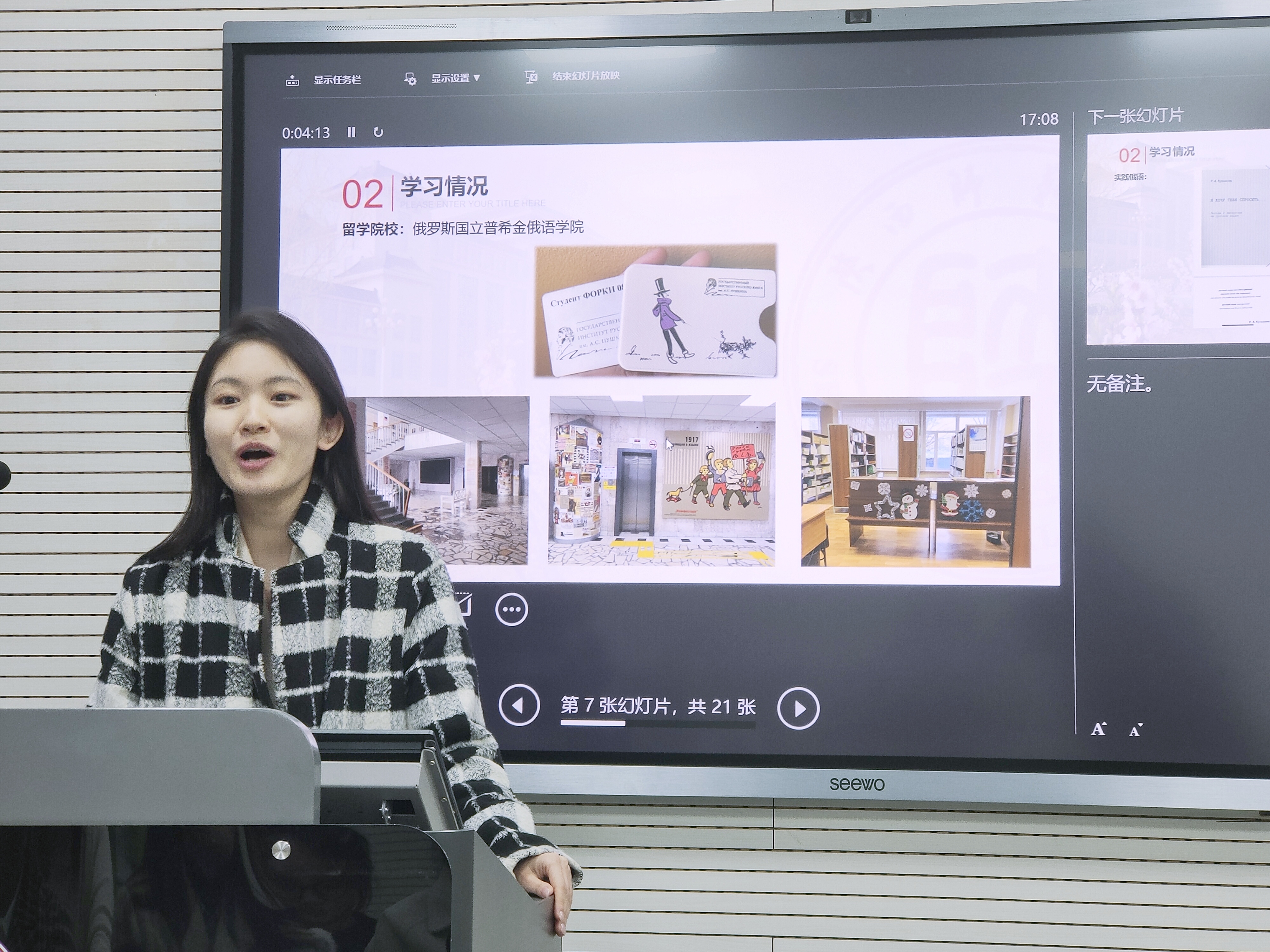 田卓同学以《开拓视野,感知文化》为题作公派留学经验分享。他细致讲解了公派留学类别、留学时限、资助数额、申请流程等信息,并结合自身留学经历,提出相关注意事项。田卓同学展示了摄影作品,使在座观众领略到俄罗斯风光,了解留学生的日常生活。最后,他鼓励同学们亲身体悟异域文化,打破对他国文化的刻板印象。