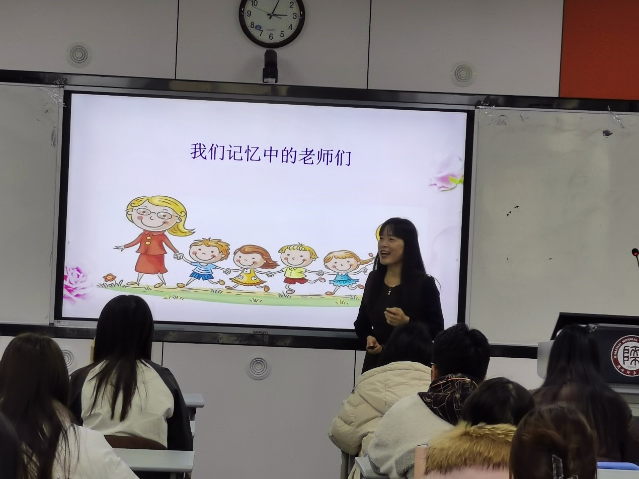 云雅峰老师首先以“我们记忆中的老师们”为引子和同学们进行互动,借用苏霍姆林斯基的教育名言和习近平总书记的“四有好老师”,提出了好老师的概念和标准。她强调了在职业发展中良好的人际关系和不断学习的重要性。她说:“在追求卓越的道路上,我们不能忽视人际关系的建立和自我能力的提升。”她鼓励学生们在教师岗位上保持积极的心态,勇于接受挑战,并持续学习和提升自己的能力。
