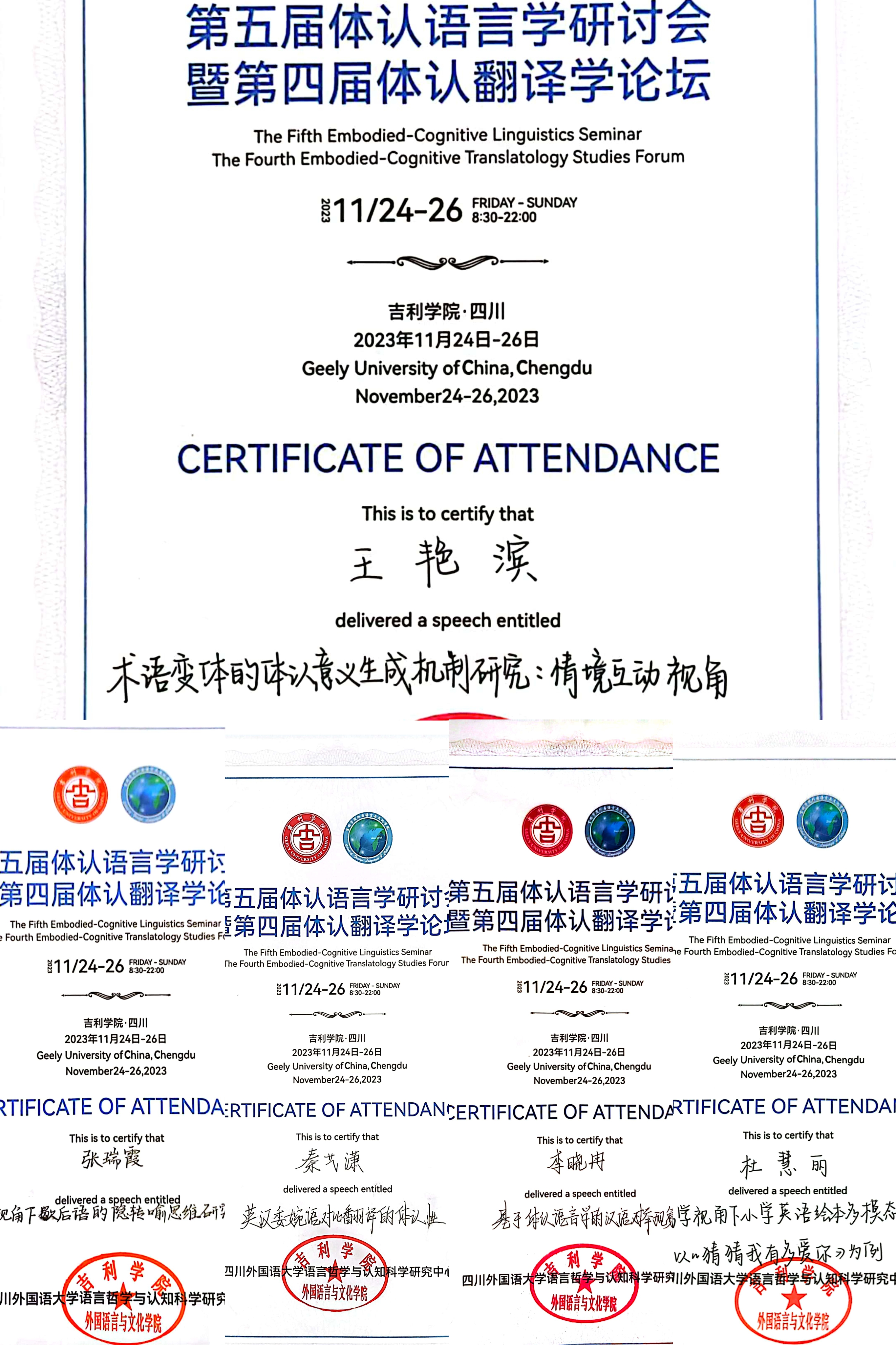 2023年11月25至26日,第五届体认语言学国际研讨会暨第四届体认翻译学论坛会议在四川成都成功举行。本次大会由体认语言学专委会与体认翻译学专委会联合主办,吉利学院外国语言与文化学院承办,多家学术期刊协办。来自国内外多所高校的近320余名专家学者和青年学生参加了本次会议。大会历时一天半,共有19位专家进行主旨发言,6个分会场和1场主编“面对面”论坛。