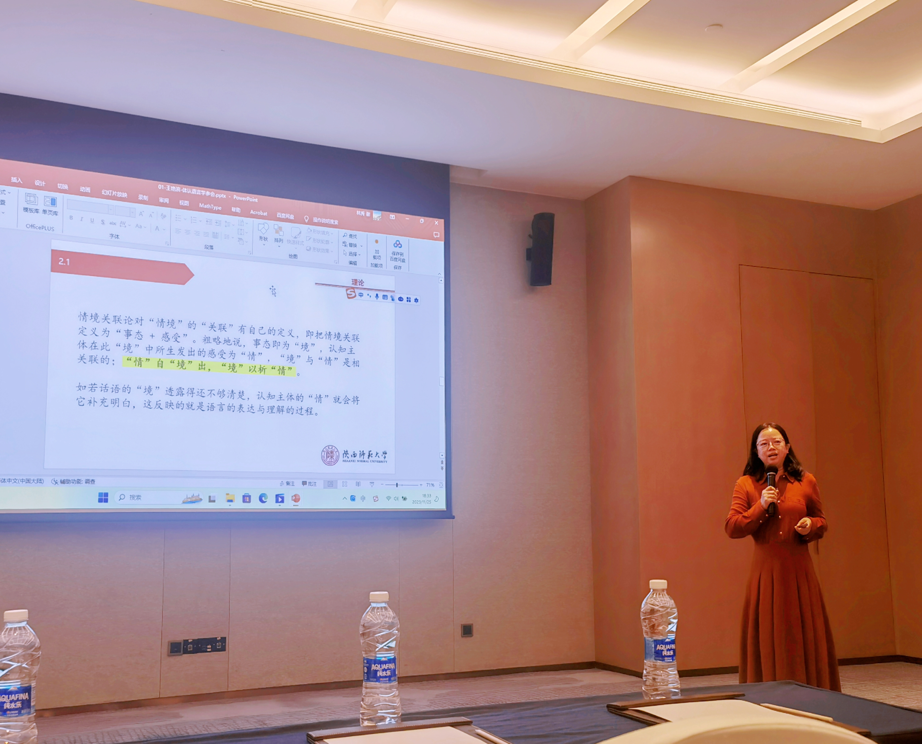 李晓冉的发言题目为“基于体认语言学的汉语对举现象研究”,从体认语言学出发探究汉语对举现象的认知机制和哲学含义,发现汉语对举现象反映了汉民族的对称性思维方式,是隐转喻互动的结果,体现了中国传统哲学中的整体性观念和阴阳哲学对立统一的思想。