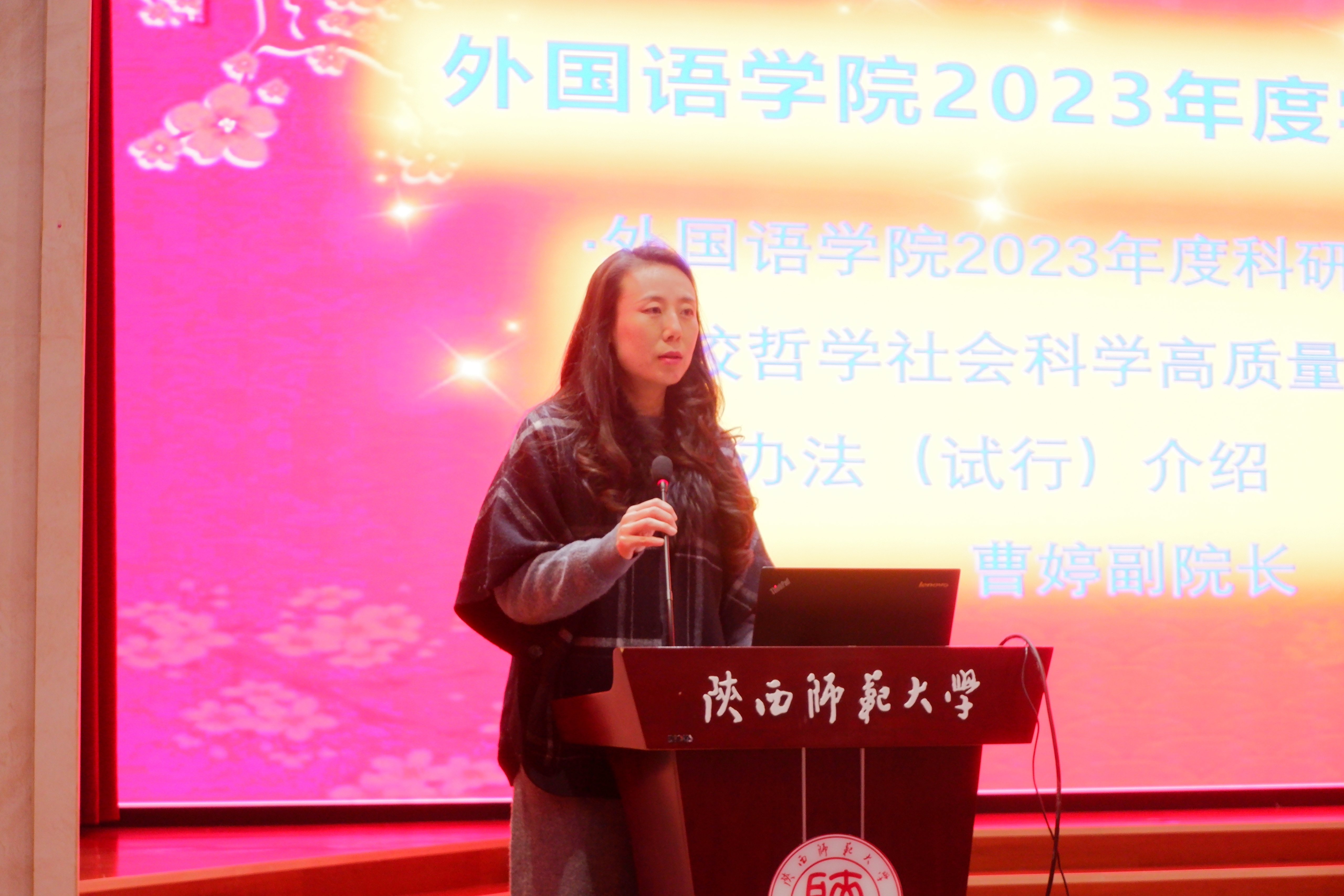 副院长曹婷教授总结了学院在过去一年中所取得的学术成果,介绍了学校《哲学社会科学高质量发展科研业绩认定办法(试行)》,并鼓励各位教师继续保持昂扬的斗志,共同迎接即将到来的2024年。