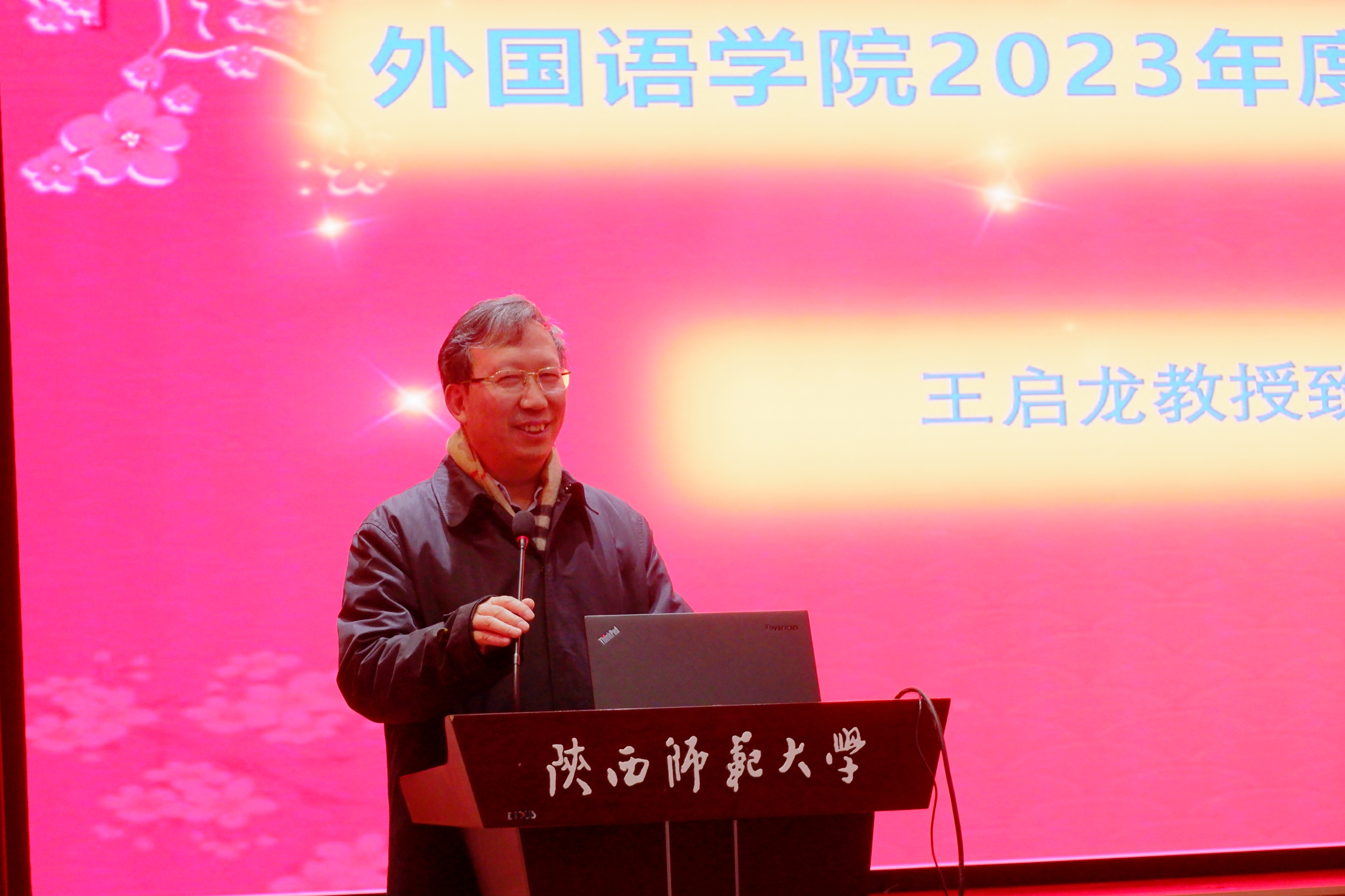王启龙教授致辞。他向学院取得标志性成果、新入职的教师、新晋升的教授及副教授表示祝贺,并提出对全体教职员工的新期待。他强调,新的形势对教师和专业人才的要求不断提高,全体教职工要勇于承担责任,在新时代、新条件下做出新成绩。