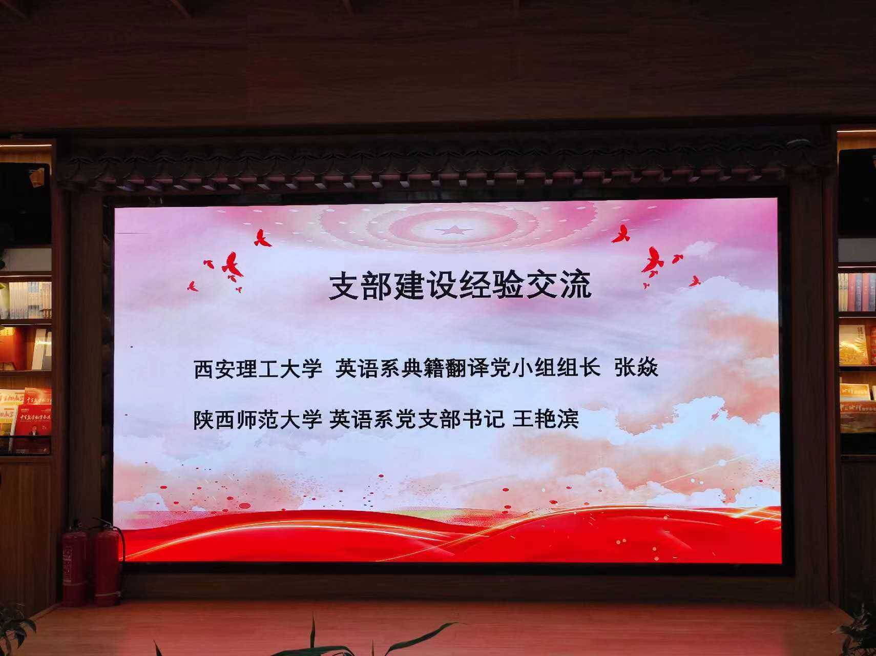 随后,西安理工大学英语系典籍翻译党小组组长张焱副教授以及76net必赢官网手机版英语系党支部书记王艳滨副教授,分别就各自支部建设情况进行分享。张焱副教授从支部双融双促的党建工作出发,分享了党建引领科研、教学、学科建设、人才培养、就业和创业等多方面内容;王艳滨副教授从支部工作理念、支部特色党日活动、政治理论规范学习记录、支部党员科研项目成效等方面进行了分享。通过分享,两支部都对彼此有了更深的了解,同时也体现出党建与业务工作相结合,与学术研究相融合的重要意义。