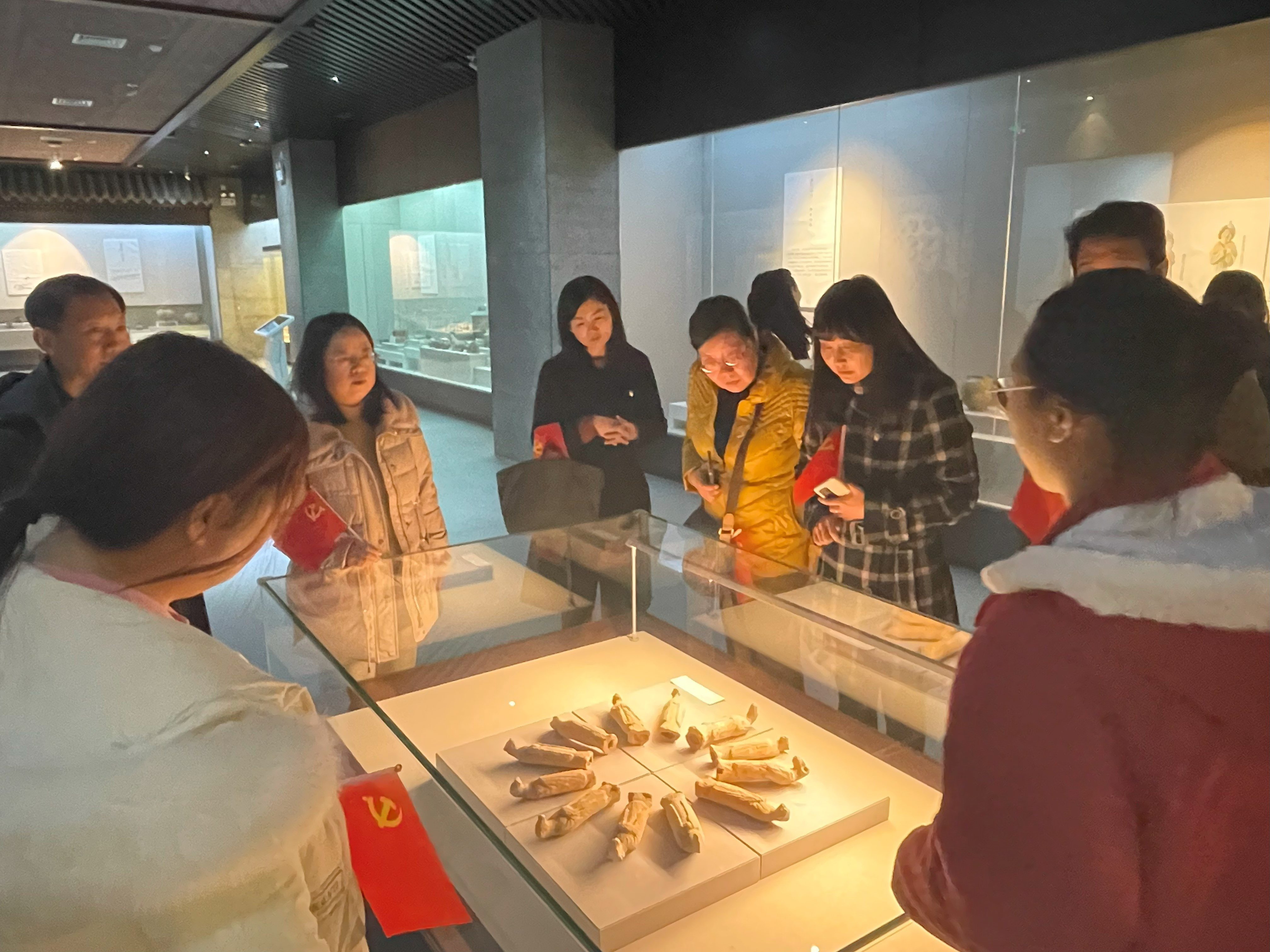 我校教育博物馆中的历史文化馆现收藏历代文物约1500余件,分为“泥火塑精灵”“吉金铸国史”“贞石镌春秋”三个部分展出。跟随讲解员的脚步,各位党员参观了精美的青铜器、古代书籍、古代兵器等。这些珍贵的展品不仅展示了中国古代文明的辉煌与智慧,也体现出我校浓厚的历史底蕴。