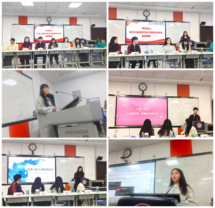 五位优秀少数民族学生代表依次开展分享。2023级东乡族研究生党员马君珊以“此岸,彼岸”为主题分享了自己的成长选择,2023级回族研究生张嘉怡以“积极参与,无限可能”为主题讲述了校园生活经历,2020级蒙古族本科生党员王路峣以“我的大学”为主题分享了自己学生会主席的成长经历,2021级回族本科生党员杨晓米以“敢于尝试,坚定选择”为主题分享了自己参加竞赛和志愿活动的经验,2022级蒙古族本科生何诺冉以“机遇+努力”为主题分享了学生干部和学习经历。现场师生进行了热烈的互动交流。