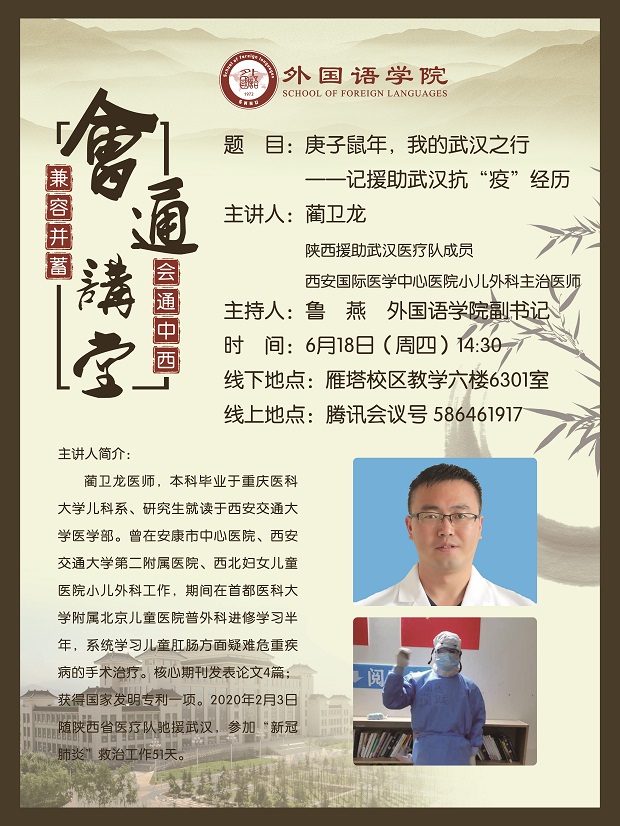根据《76net必赢官网手机版关于做好2020年上半年教职工师德师风涵养教育的安排意见》和学校2020年工作要点要求,各学院要深入学习贯彻落实习近平总书记对疫情防控工作的重要批示指示和讲话精神,深化爱国主义教育,强化“四个自信”。学院定于6月18日(周四)下午2:30举办学院“抗击疫情精神分享会”,特邀西安国际医学中心医院蔺卫龙医生分享自己在武汉的抗疫经历,请大家积极参加。