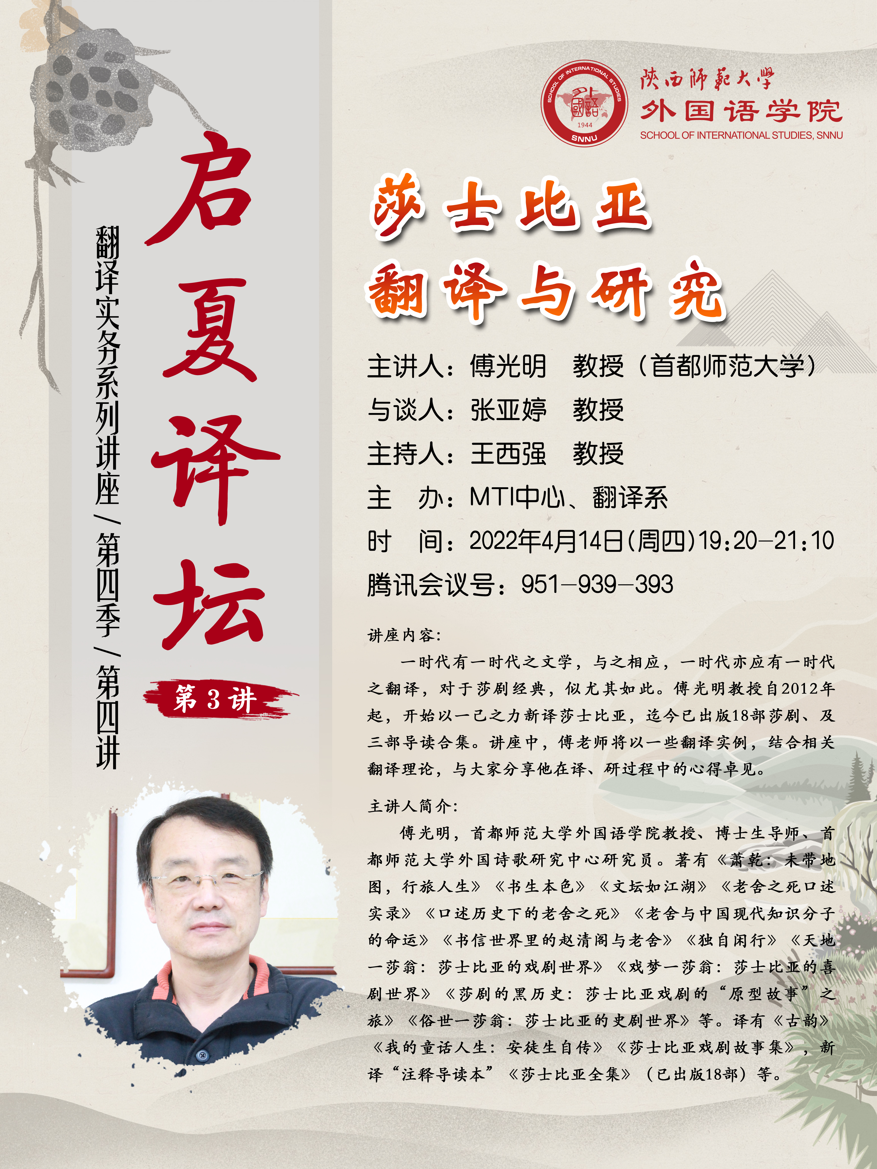 一时代有一时代之文学,与之相应,一时代亦应有一时代之翻译,对于莎剧经典,似尤其如此。傅光明教授自2012年起,开始以一己之力新译莎士比亚,迄今已出版18部莎剧、及三部导读合集。讲座中,傅老师将以一些翻译实例,结合相关翻译理论,与大家分享他在译、研过程中的心得卓见。